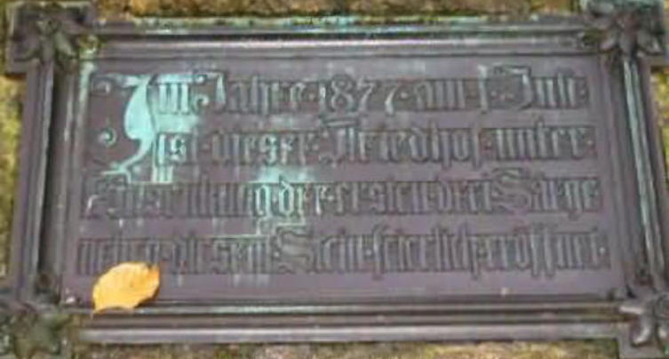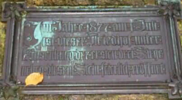 Auf dem Gedenkstein dort geschrieben:Im Jahre 1877 am 1.Juliist dieser Friedhof unterEinsenkung der ersten drei Särgeneben diesem Stein feierlich eröffnet.